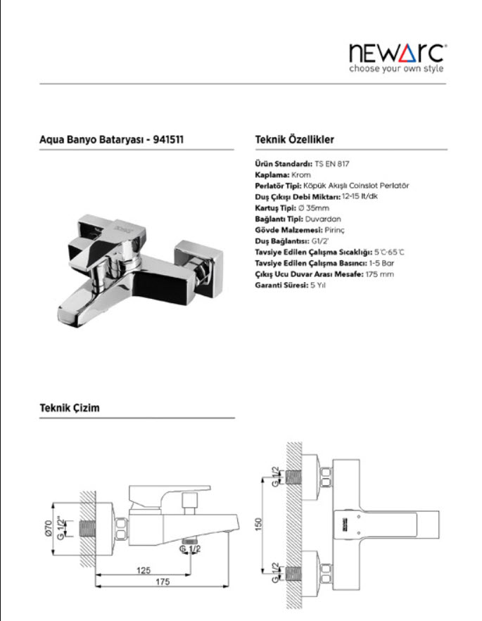 941511 Newarc Aqua Banyo Bataryası Krom