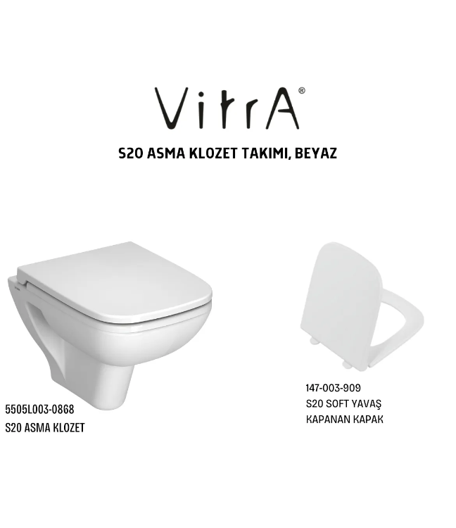 VitrA S20 Asma Klozet 5505L003-0868, Vitra S20 Soft Yavaş Kapanır Kapak 147-003-909