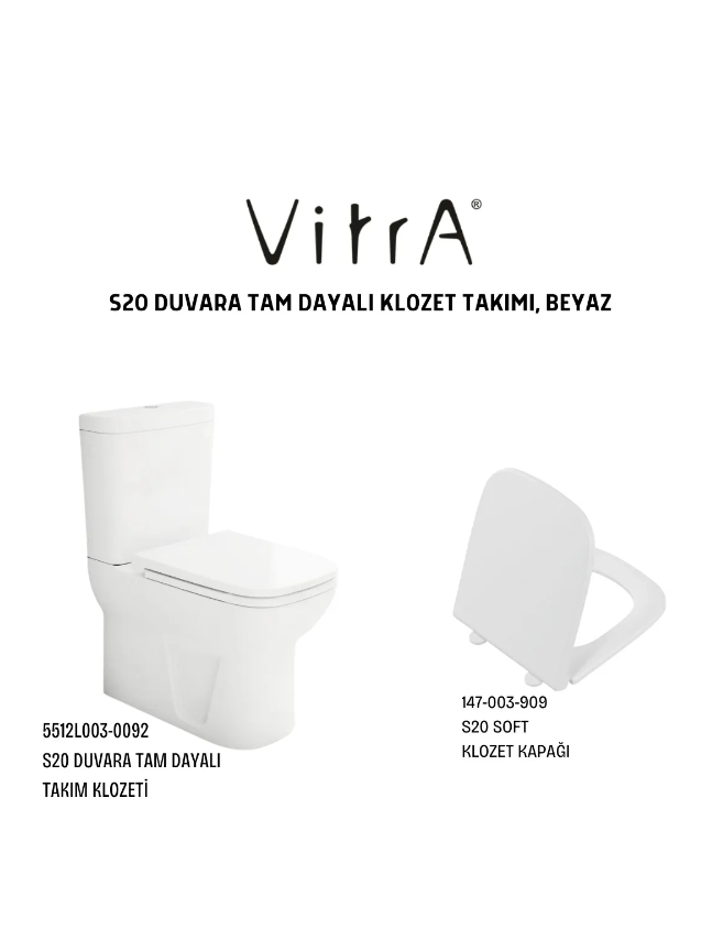 VitrA S20 Duvara Tam Dayalı Klozet 5512L003-0092, Vitra S20 Soft Klozet Kapağı 147-003-909